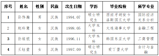 按照集團10月11日發(fā)布的招聘公告,經過簡歷投遞、資格審查、筆試、面試、背景調查、集體決策等環(huán)節(jié),確定擬錄用人員,現予以公示,公示期為5個工作日(12月6日至12月10日)。公示期間如有異議,請與煙臺市財金發(fā)展投資集團有限公司聯系,電話:0535-6887160。